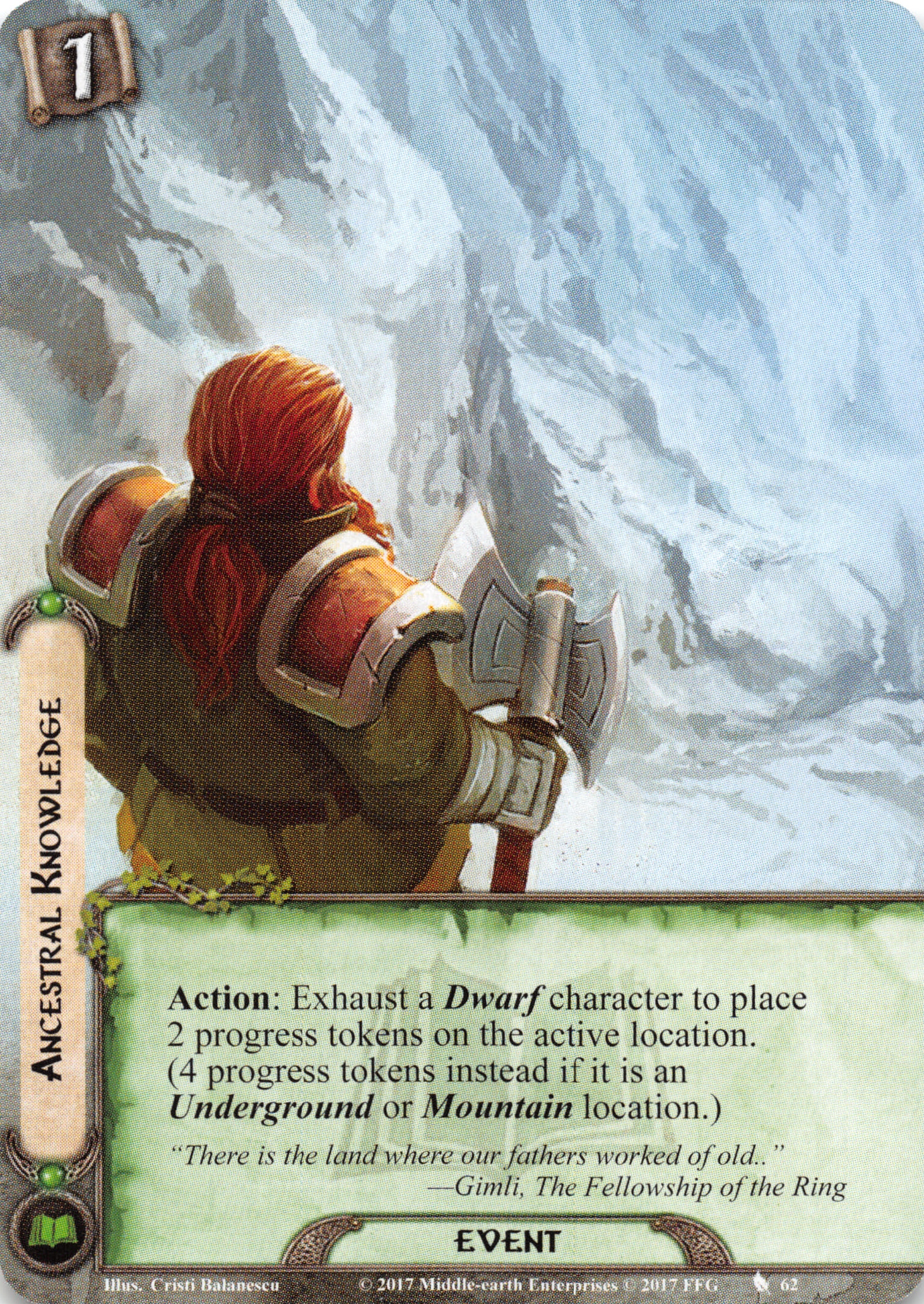 Action: Exhaust a Dwarf character to place 2 progress tokens on the active location. (4 progress tokens instead if it is an Underground or Mountain location.)