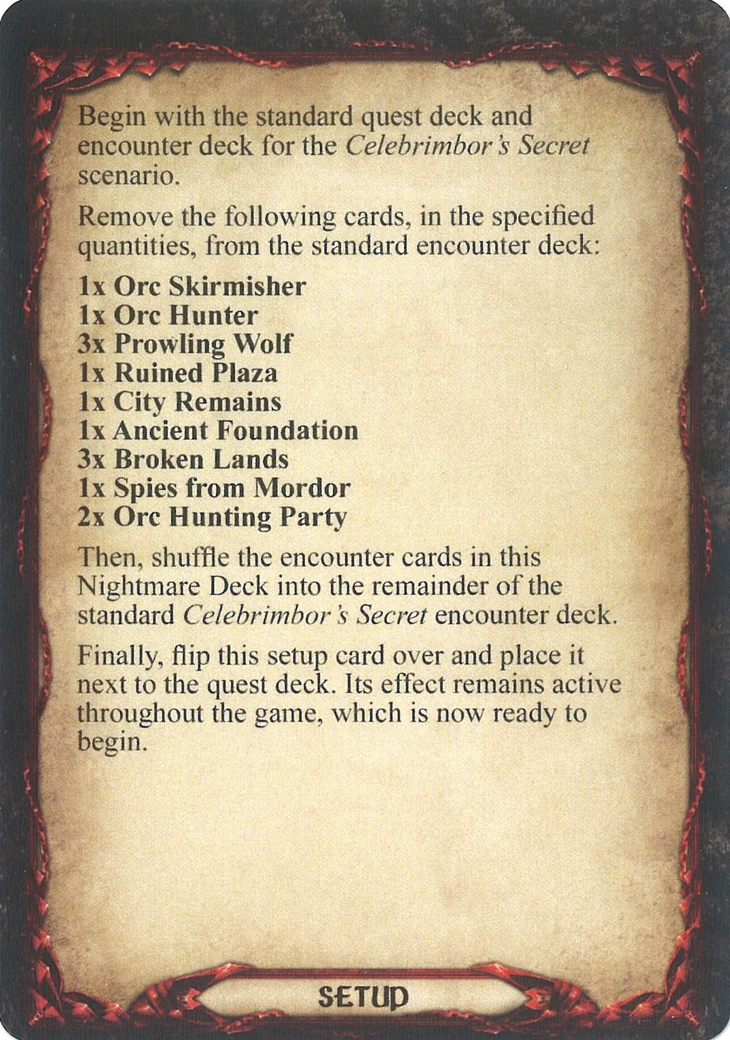 Then, shuffle the encounter cards in this Nightmare Deck into the remainder of the standard Celebrimbor's Secret encounter deck.