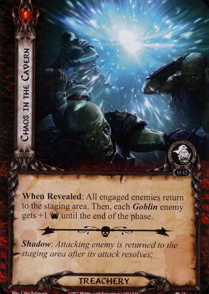 When Revealed: All engaged enemies return to the staging area. Then, each Goblin enemy gets +1 Threat until the end of the phase.