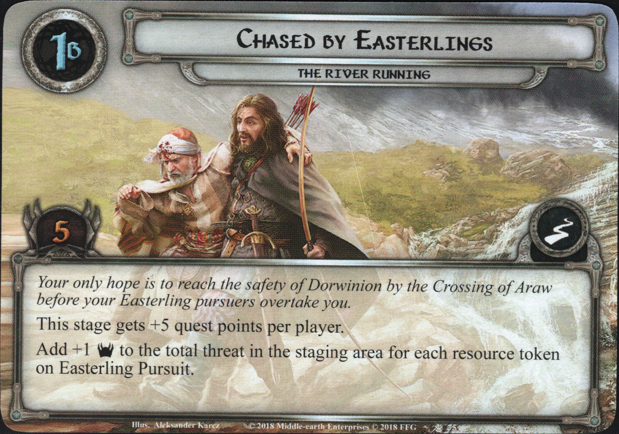 Setup: Set Warriors of the East aside, out of play. Add Easterling Pursuit and 1 copy of River Running to the staging area. Each player adds 1 different Easterling enemy to the staging area. Shuffle the encounter deck.