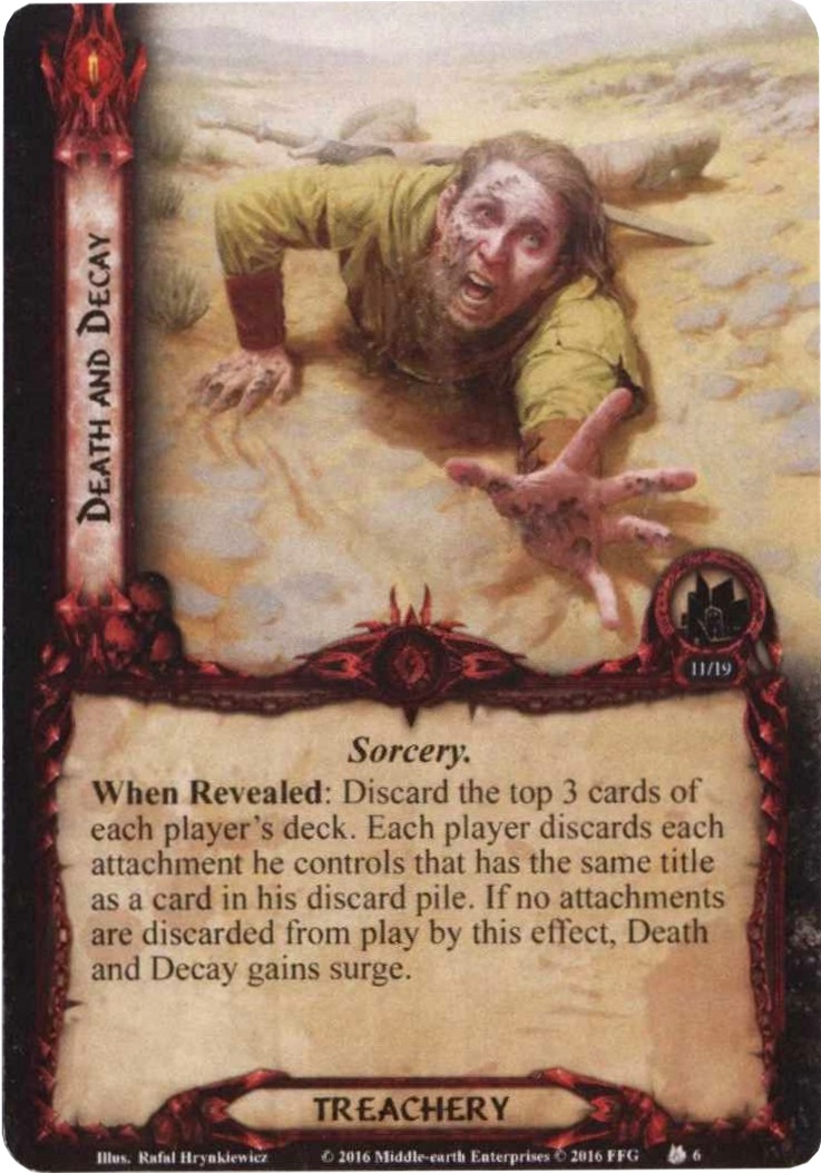 When Revealed: Discard the top 3 cards of each player's deck. Each player discards each attachment he controls that has the same title as a card in his discard pile. If no attachments are discarded from play by this effect, Death and Decay gains surge.