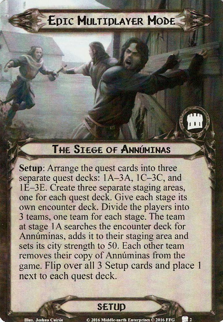Setup: Arrange the quest cards into three separate quest decks: 1A-3A, 1C-3C, and 1E-3E. Create three separate staging area, one for each quest. Give each stage its own encounter deck. Divide the players into 3 teams, one team for each stage. The team at stage 1A searches the encounter deck for Annúminas, adds it to the staging area and sets its city strength to 50. Each other team removes their copy of Annúminas from the game. Flip over all 3 Setup cards and place 1 next to each quest deck.