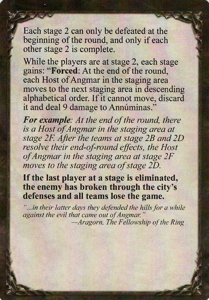 Each stage 2 can only be defeated at the beginning of the round, and only if each other stage 2 is complete.While the players are at stage 2, each stage gains:"Forced: At the end of the round, each Host of Angmar in the staging area moves to the next staging area in descending alphabetical order. If it cannot move, discard it and deal 9 damage to Annúminas."