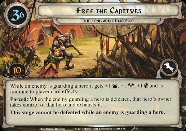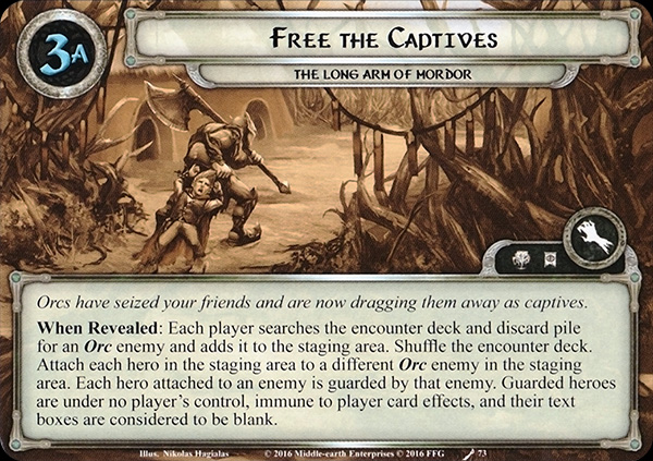 When Revealed: Each player searches the encounter deck and discard pile for an Orc enemy and adds it to the staging area. Shuffle the encounter deck. Attach each hero in the staging area to a different Orc enemy in the staging area. Each hero attached to an enemy is guarded by that enemy. Guarded heroes are under no player's control, immune to player card effects, and their text boxes are considered to be blank.