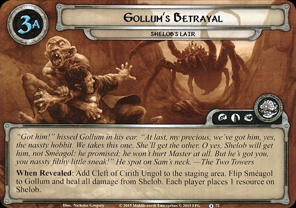 When Revealed: Add Cleft of Cirith Ungol to the staging area. Flip Sméagol to Gollum and heal all damage from Shelob. Each player places 1 resource on Shelob.