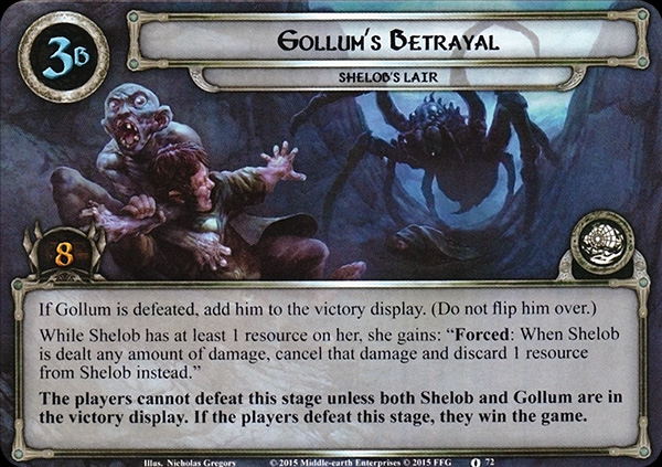 The players cannot defeat this stage unless both Shelob and Gollum are in the victory display. If the players defeat this stage, they win the game.