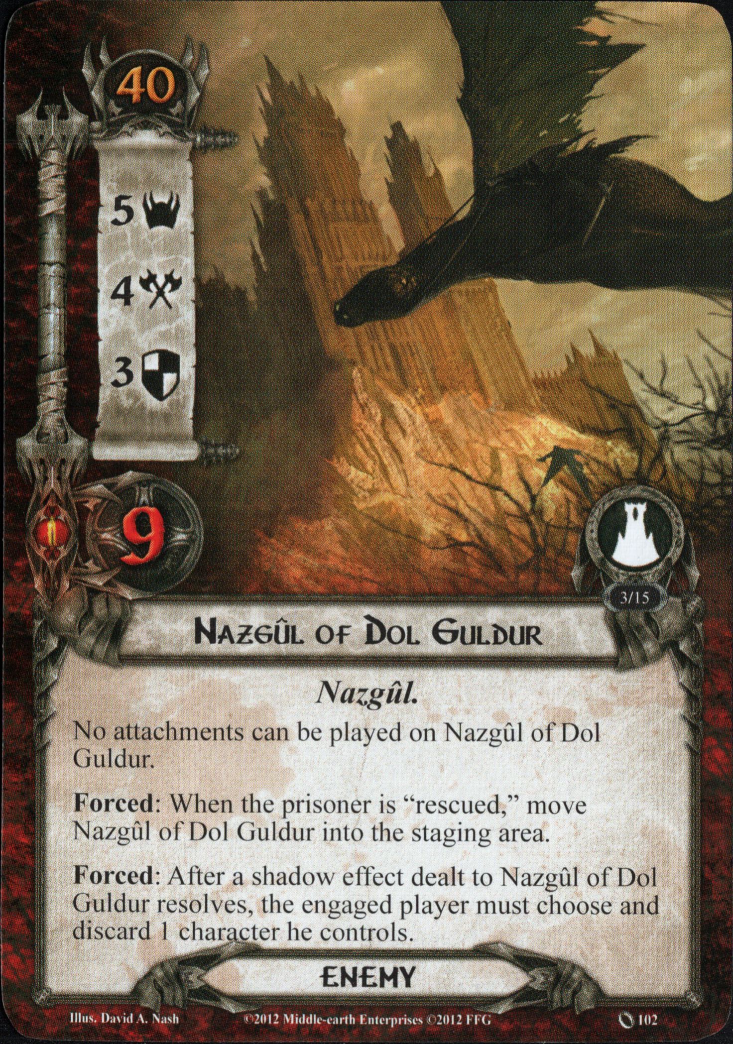 Forced: After a shadow effect dealt to Nazg没l of Dol Guldur resolves, the engaged player must choose and discard 1 character he controls.
