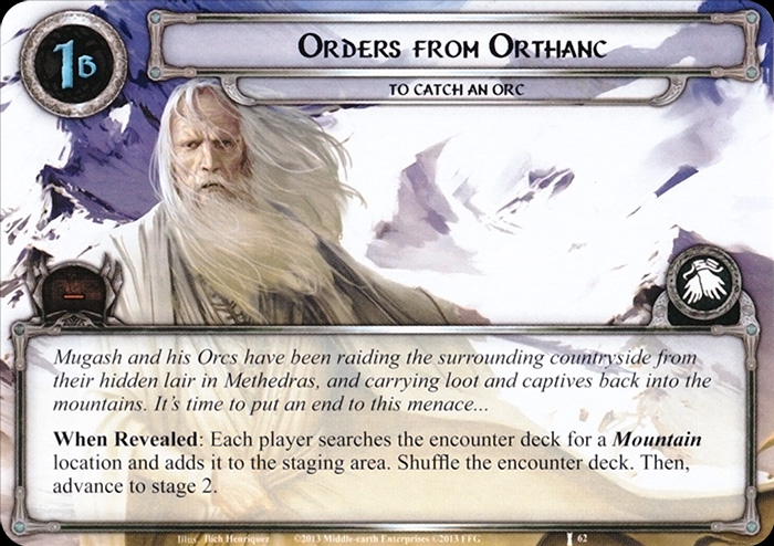 When Revealed: Each player searches the encounter deck for a Mountain location and adds it to the staging area. Shuffle the encounter deck. Then, advance to stage 2.