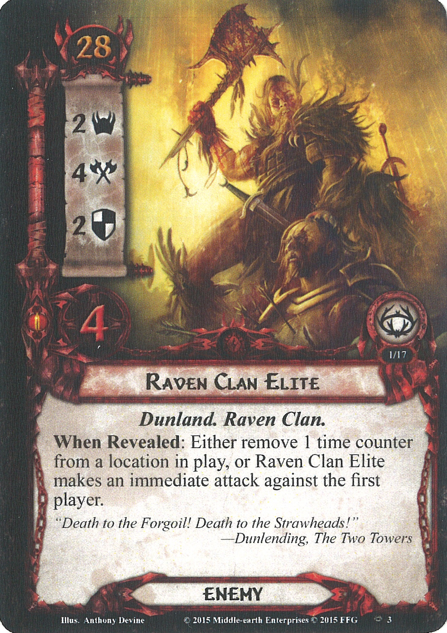 When Revealed: Either remove 1 time counter from a location in play, or Raven Clan Elite make an immediate attack against the first player.