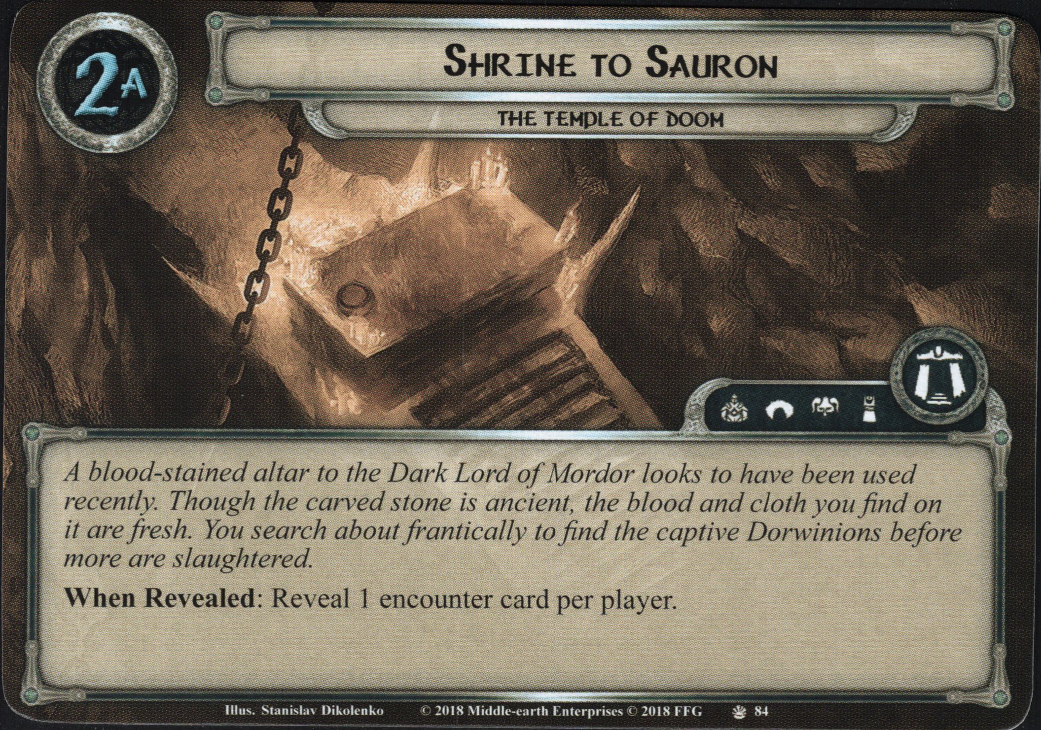 A blood–stained altar to the Dark Lord of Mordor looks to have been used recently. Though the carved stone is ancient, the blood and cloth you find on it are fresh. You search about frantically to find the captive Dorwinions before more are slaughtered.