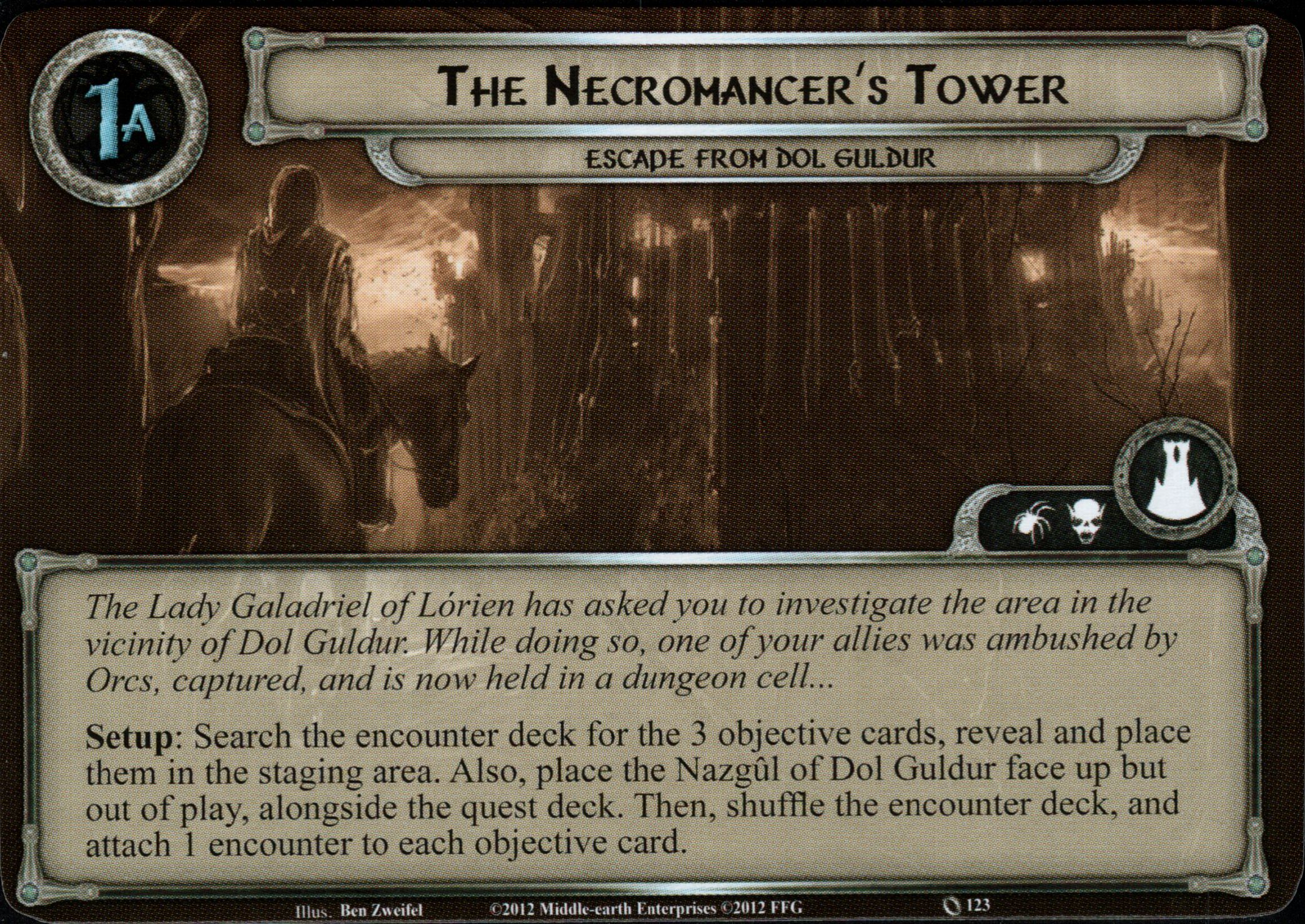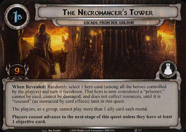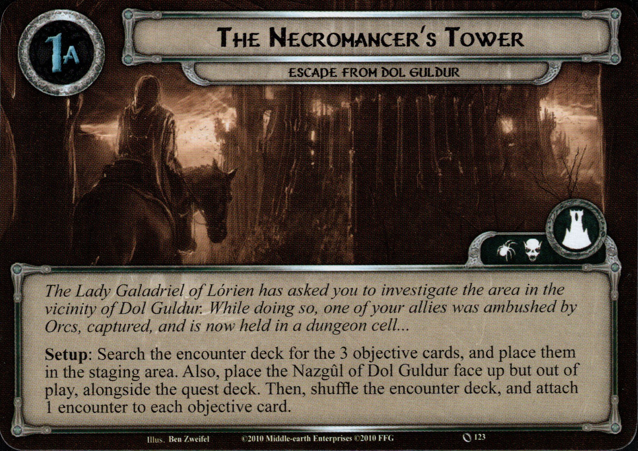 Setup: Search the encounter deck for the 3 objective cards, reveal and place them in the staging area. Also, place the Nazgûl of Dol Guldur face up but out of play, alongside the quest deck. Then, shuffle the encounter deck, and attach 1 encounter to each objective card.
