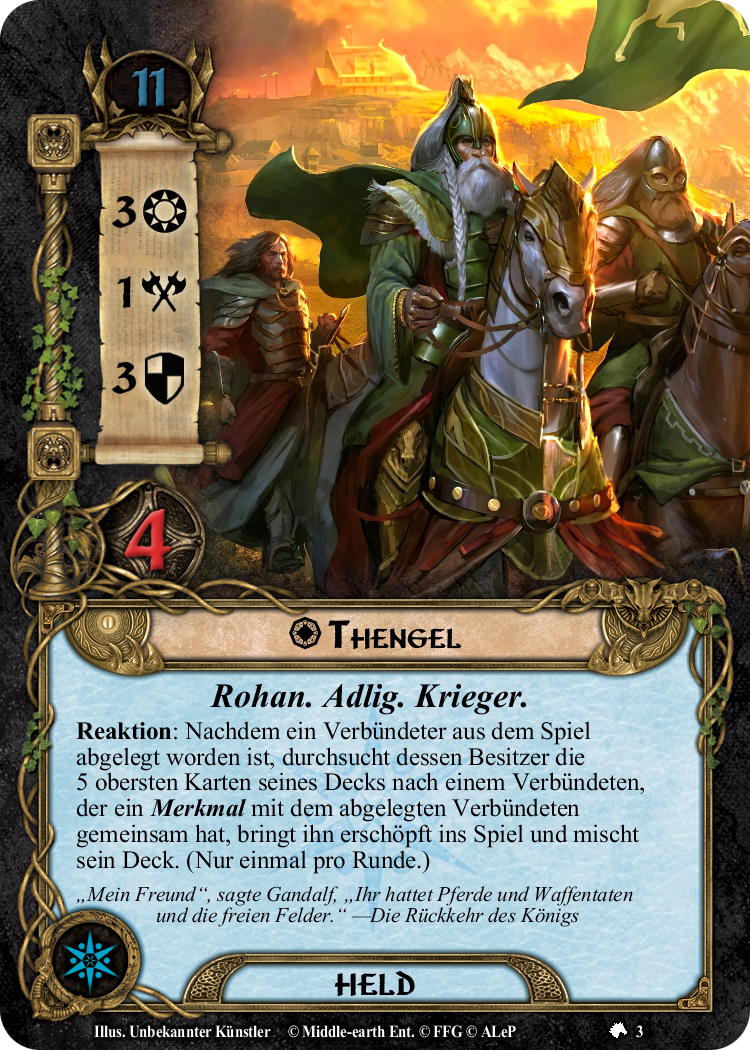 Response: After an ally is discarded from play, that ally’s owner searches the top 5 cards of their deck for an ally that shares a Trait with the discarded ally, puts it into play exhausted, and shuffles their deck. (Limit once per round.)