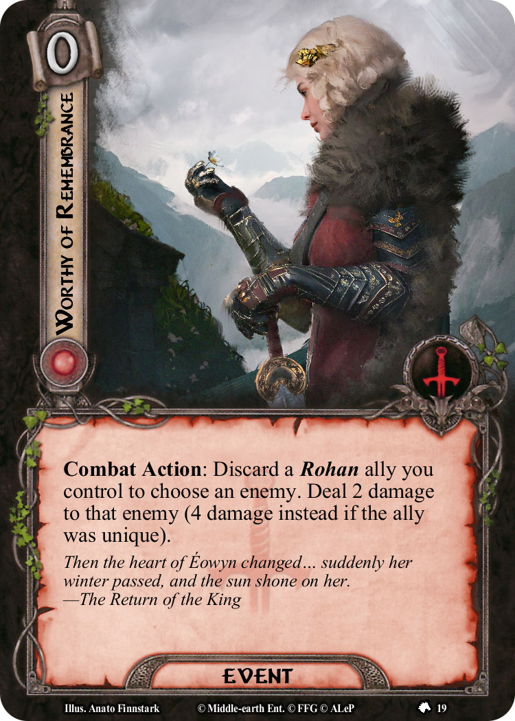 Combat Action: Discard a Rohan ally you control to choose an enemy. Deal 2 damage to that enemy (4 damage instead if the ally was unique).