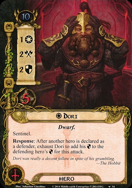 Response: After another hero is declared as a defender, exhaust Dori to add his Defense to the defending hero's Defense for this attack.