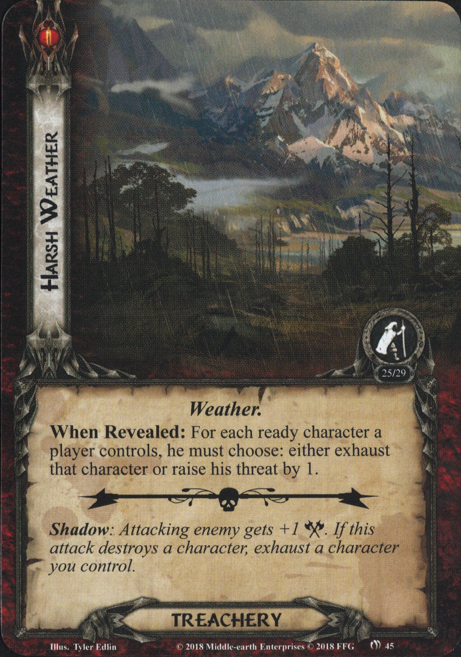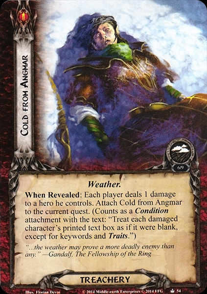 When Revealed: Each player deals 1 damage to a hero he controls. Attach Cold from Angmar to the current quest. Counts as a Condition attachment with the text: