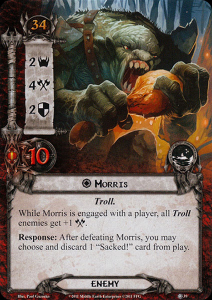 Forced: After Gorgoroth Hill-troll attacks and destroys a character, the defending player discards a random card from his and hand and raises his threat by that card's printed cost.