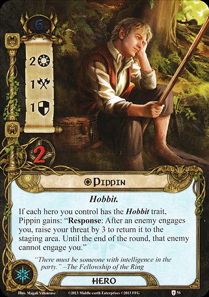 Response: After you engage an enemy with an engagement cost higher than your threat, ready Pippin.