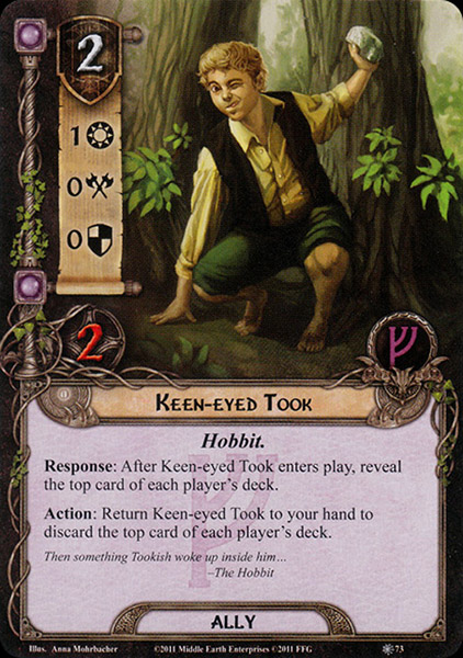 Action: Reduce your threat by 3 to give control of Wandering Took to another player. Raise that player's threat by 3. (Limit once per round.)