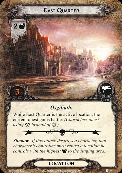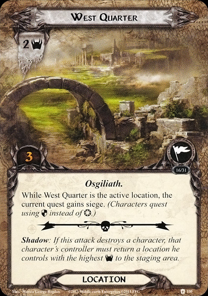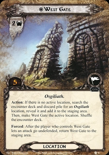Action: If there is no active location, search the encounter deck and discard pile for an Osgiliath location, reveal it and add it to the staging area. Then, make West Gate the active location. Shuffle the encounter deck.