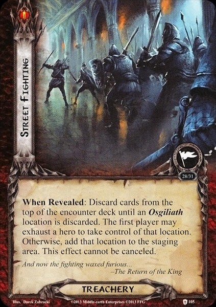 When Revealed: Discard cards from the top of the encounter deck until an Osgiliath location is discarded. The first player may exhaust a hero to take control of that location. Otherwise, add that location to the staging area. This effect cannot be canceled.