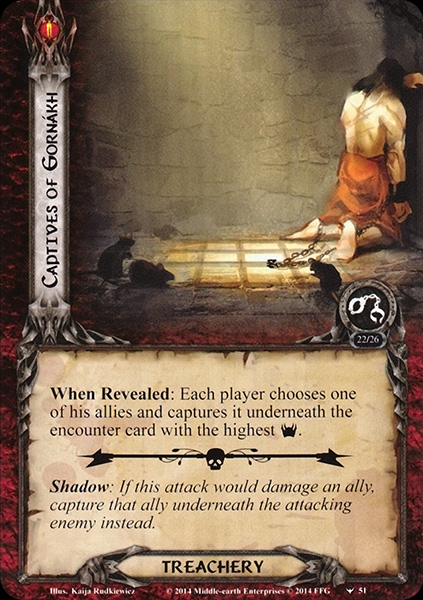 Forced: After 1 or more captured cards are rescued, Jailor Gornákh engages the player with the highest threat and makes an immediate attack.