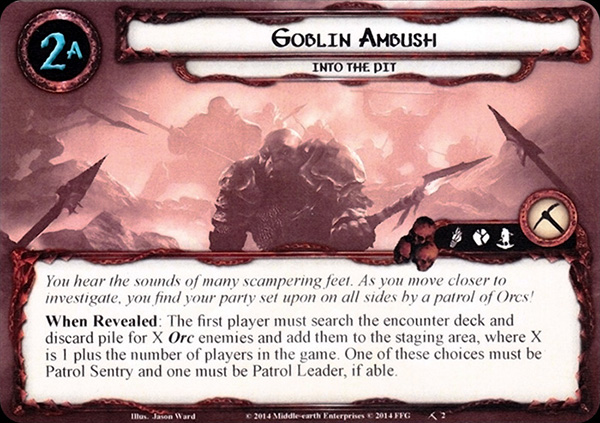 When Revealed: The first player must search the encounter deck and discard pile for X Orc enemies and add them to the staging area, where X is 1 plus the number of players in the game. One of these choices must be Patrol Sentry and one must be Patrol Leader, if able.