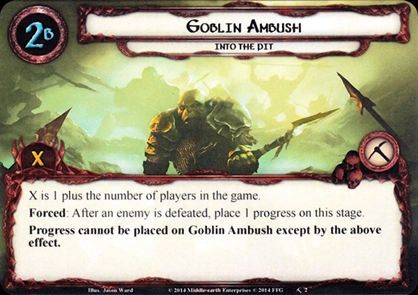 If the active location is a Dark location, Goblin Lurker gets +3Attack and -40 engagement cost.