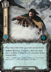 Forced: After this ally enters play, search the top 5 cards of the encounter deck for a non-unique location and add it to the staging area. If no location enters play by this effect, discard Dúnedain Pathfinder. Shuffle the encounter deck.