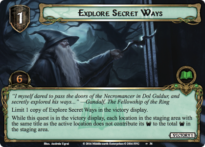 While Explore Secret Ways is in the victory display, each location in the staging area with the same title as the active location does not contribute its Threat to the total Threat in the staging area.