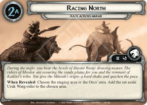 When Revealed: Attach to an Orc enemy. Limit 1 per enemy. (Counts as a Mount attachment with the text: "Attached enemy gets +1 Threat +1 Attack +1 Defense and +1 hit point.Forced: When attached enemy leaves play, return Racing Warg to the staging area.")