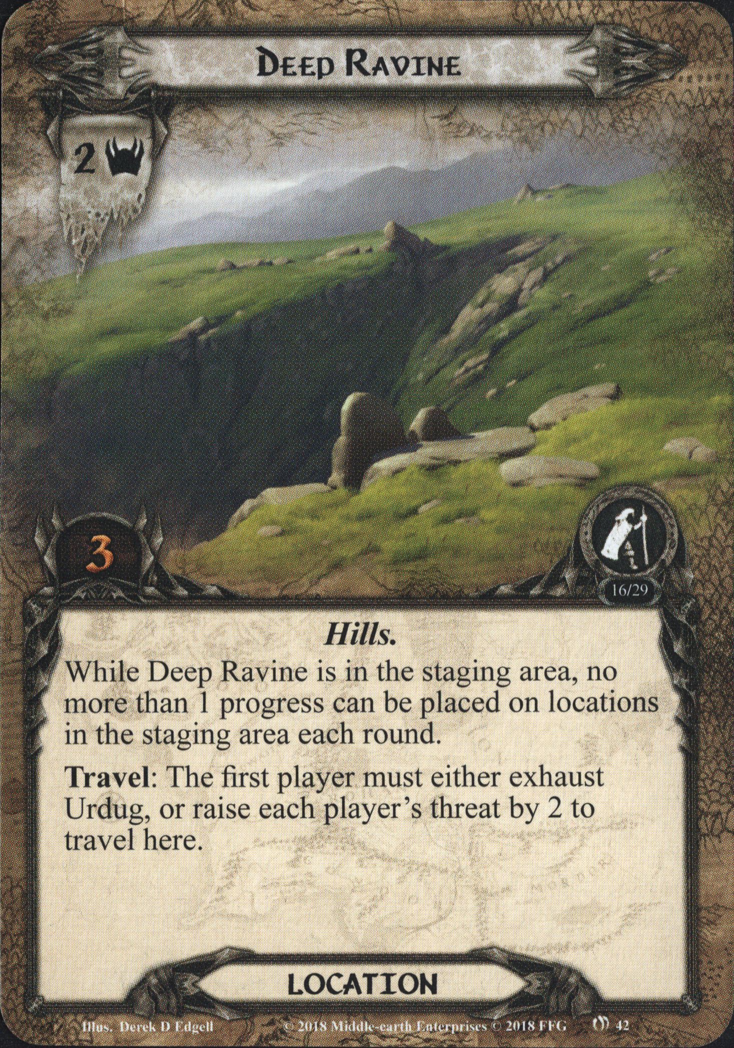 While Deep Ravine is in the staging area, no more than 1 progress can be placed on locations in the staging area each round.