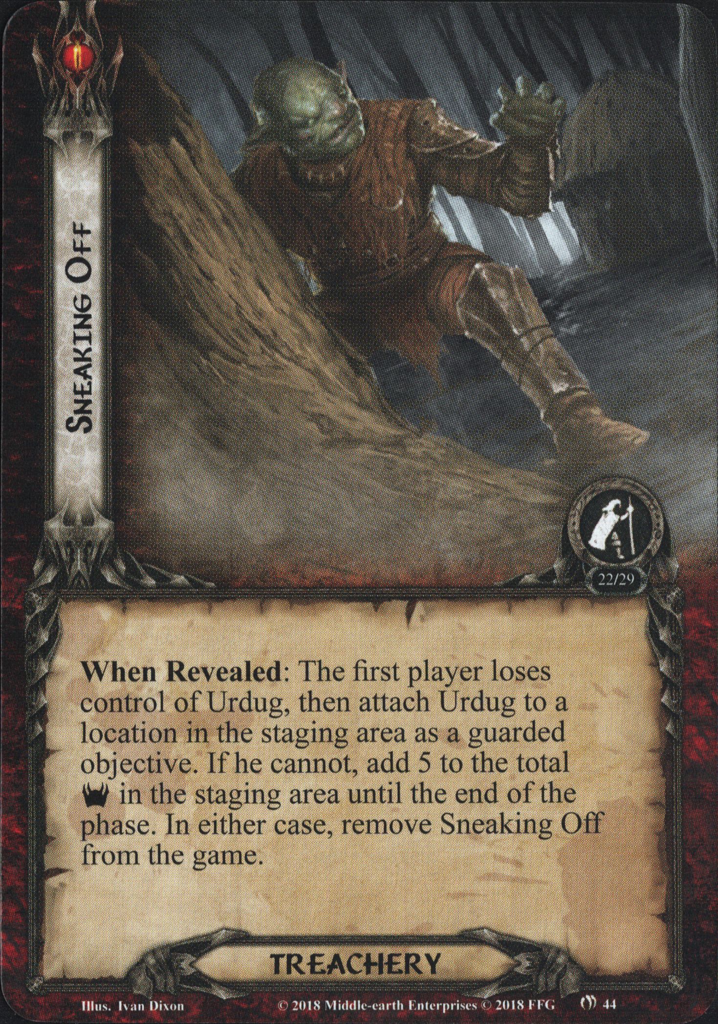 When Revealed: The first player loses control of Urdug, then attach Urdug to a location in the staging area as a guarded objective. If he cannot, add 5 to the total Threat in the staging area until the end of the phase. In either case, remove Sneaking Off from the game.