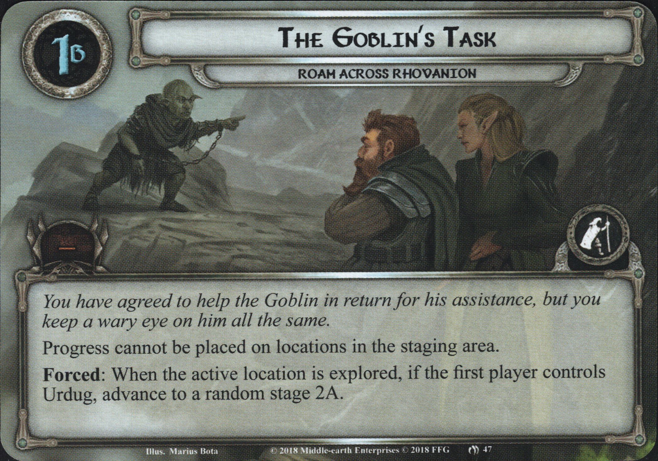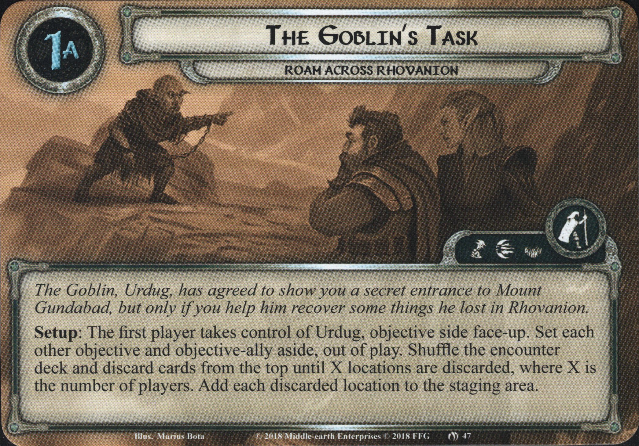 Setup: The first player takes control of Urdug, objective side face-up. Set each other objective and objective-ally aside, out of play. Shuffle the encounter deck and discard cards from the top until X locations are discarded, where X is the number of players. Add each discarded location to the staging area.
