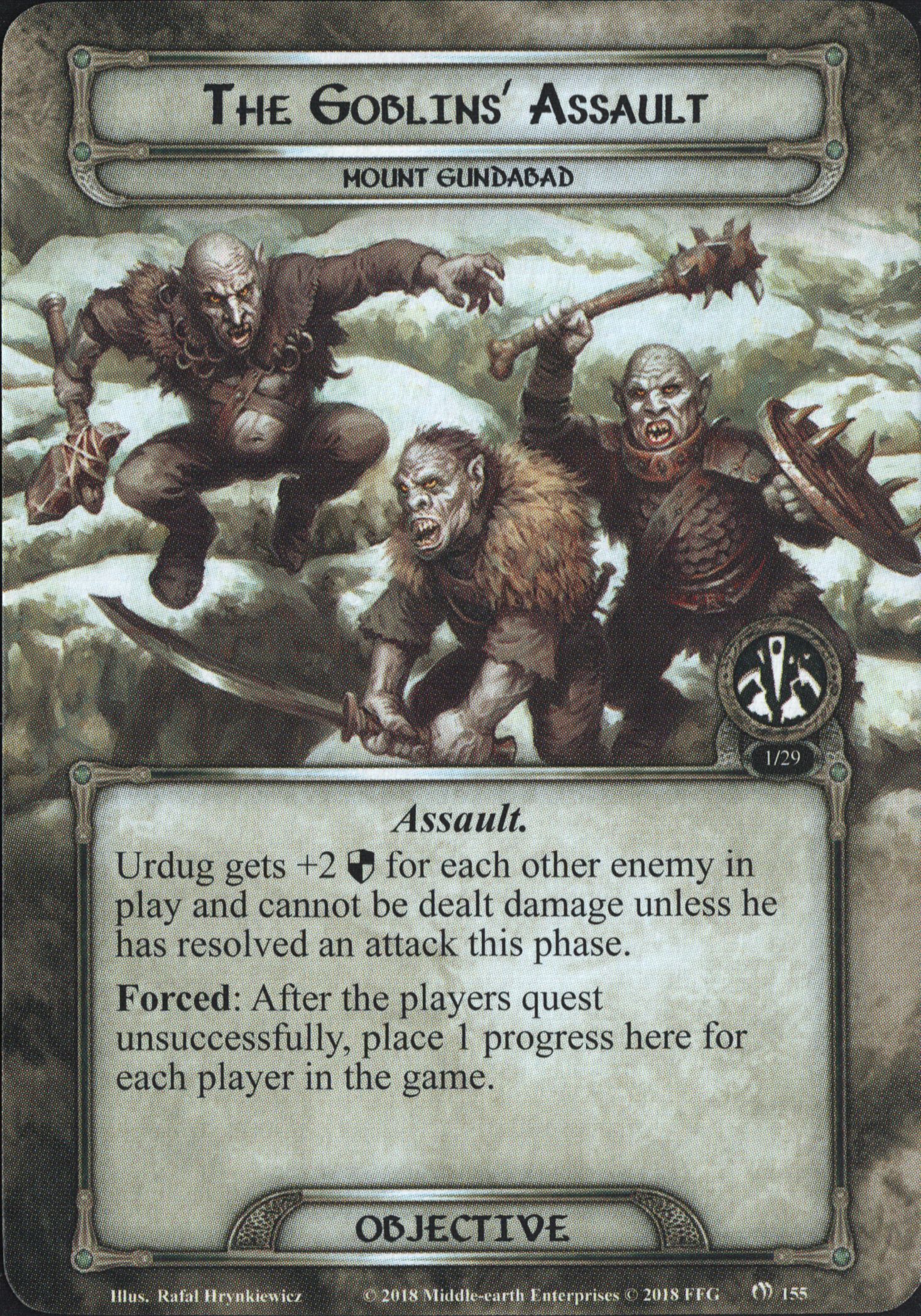 Setup: Add The Goblins' Assault, The Heroes' Defense, and Urdug to the staging area. Shuffle the encounter deck and discard cards from the top until X enemies are discarded, where X is the number of players in the game. Add those enemies to the staging area.