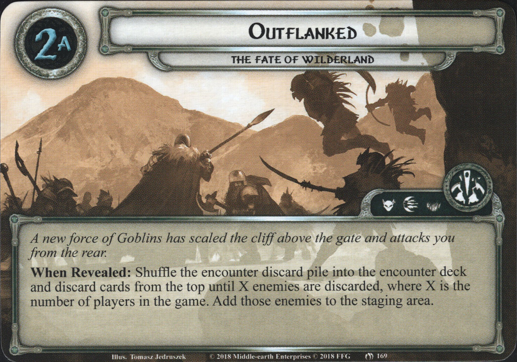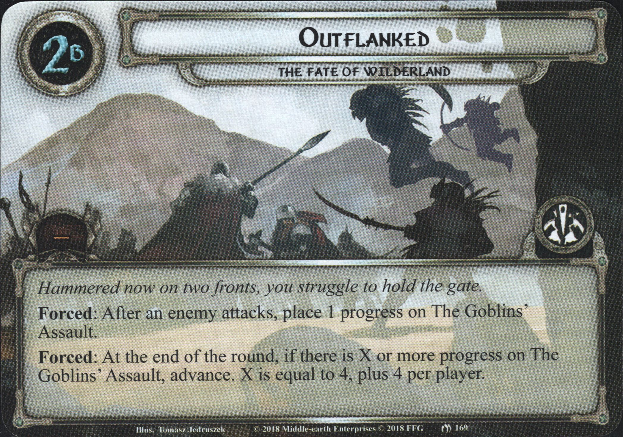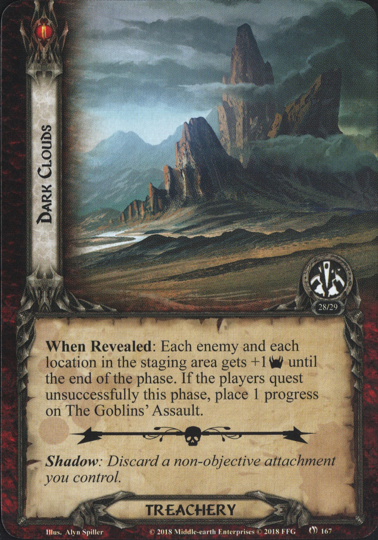 When Revealed: Each enemy and each location in the staging area gets +1 Threat until the end of the phase. If the players quest unsuccessfully this phase, place 1 progress on The Goblins' Assault.