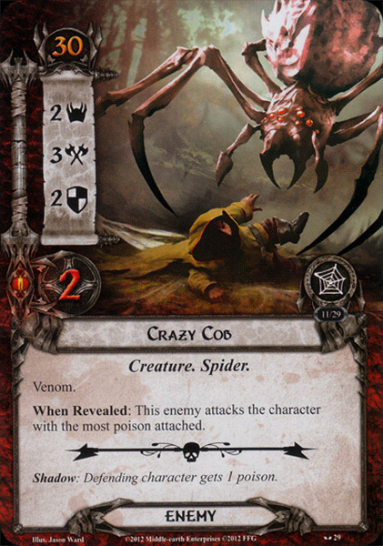 Forced: At the start of each quest phase, search the encounter deck for 1 Spider enemy and add it to the staging area. (2 Spider enemies instead if 3 or more players are at this stage.) Shuffle the encounter deck.
