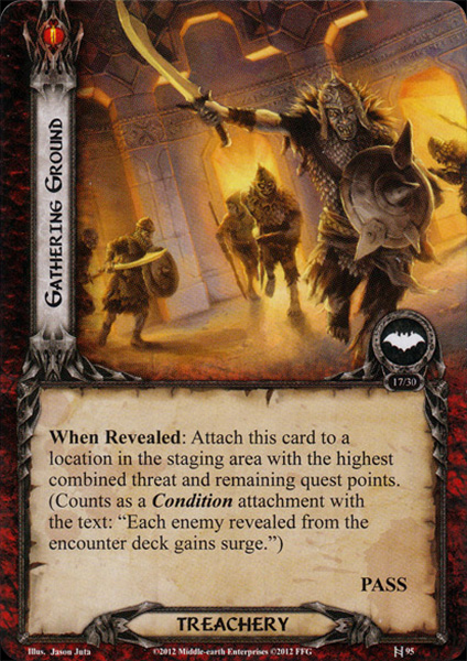 When Revealed: Attach this card to a location in the staging area with the highest combined threat and remaining quest points. Counts as a Condition attachment with the text: