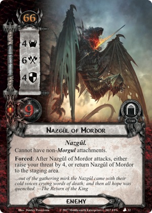 Forced: After Nazgûl of Mordor attacks, either raise your threat by 4, or return Nazgûl of Mordor to the staging area.