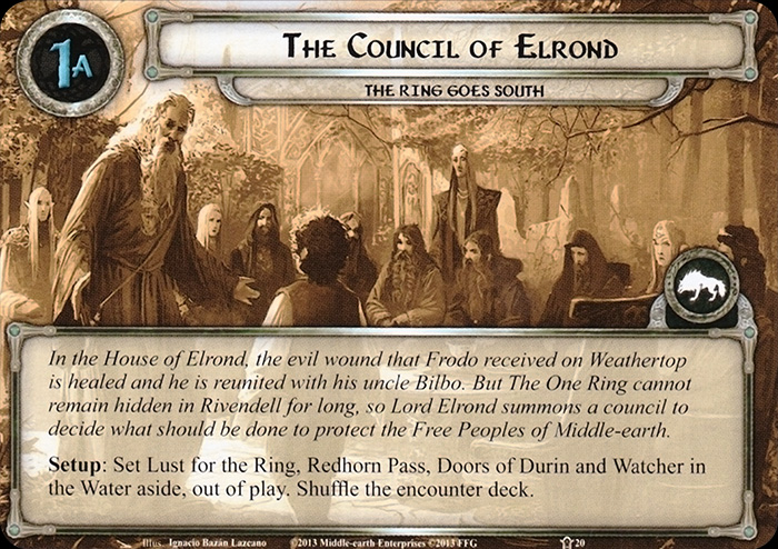 Setup: Set Lust for the Ring Redhorn Pass, Doors of Durin and Watcher in the Water aside, out of play. Shuffle the encounter deck.