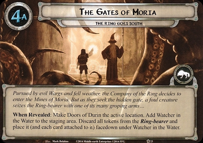 When Revealed: Make Doors of Durin the active location. Add Watcher in the Water to the staging area. Discard all tokens from the Ring-bearer and place it (and each card attached to it) facedown under Watcher in the Water.