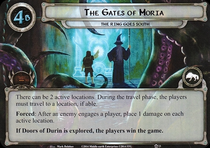 Setup: Set The Balrog, The Great Bridge, and Chamber of Mazarbul aside out of play. Add Doom Doom Doom to the staging area and place 10 damage tokens on it. Each player adds 1 different location to the staging area.