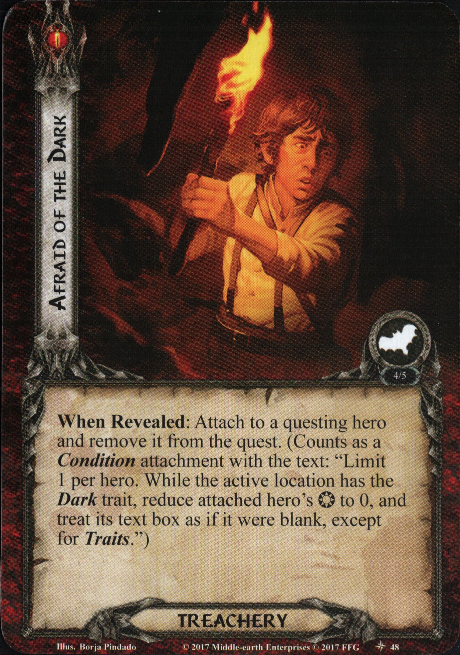 When Revealed: Attach to a questing hero and remove it from the quest. (Counts as a Condition attachment with the text: "Limit 1 per hero. While the active location has the Dark trait, reduce attached hero's