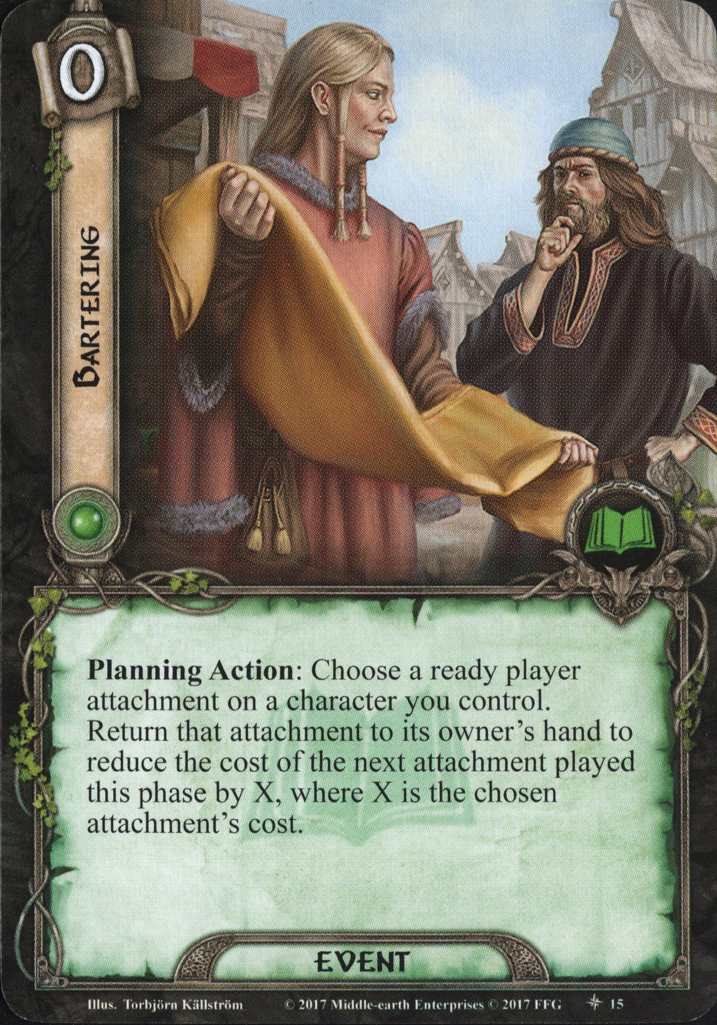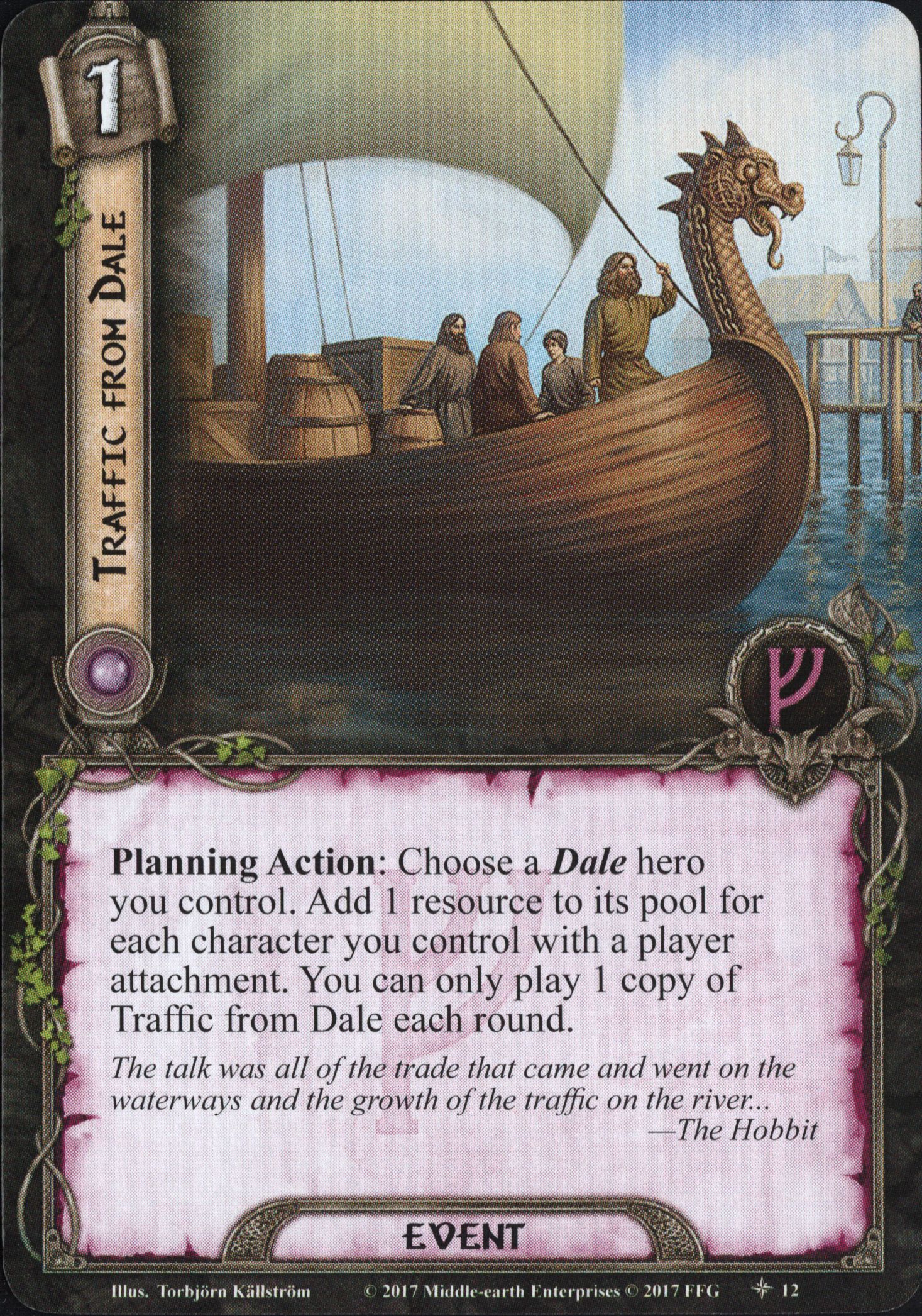 Planning Action: Choose a Dale hero you control. Add 1 resource to its pool for each character you control with a player attachment. You can only play 1 copy of Traffic from Dale each round.