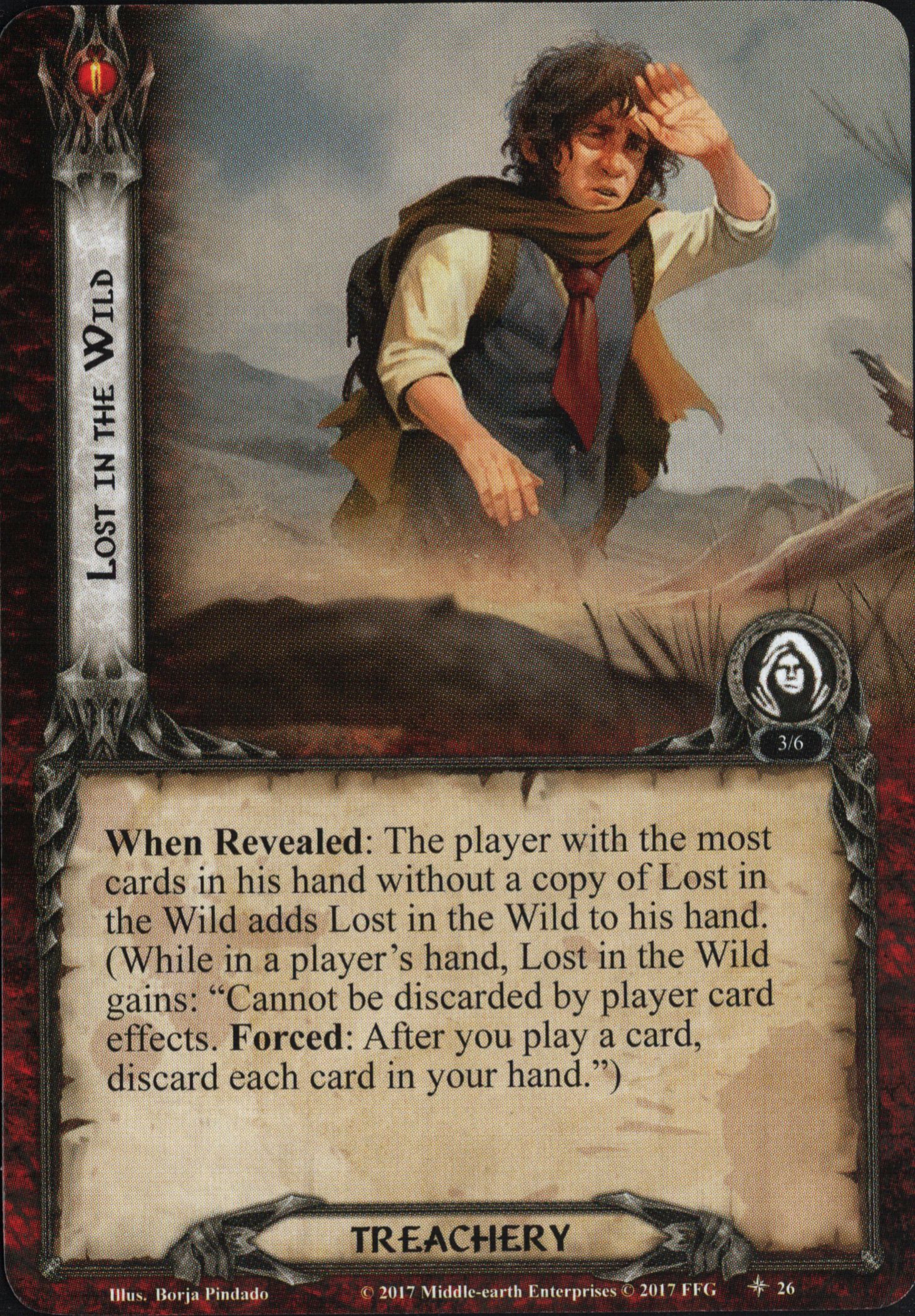 When Revealed: The player with the most cards in his hand without a copy of Lost in the Wilderness adds Lost in the Wild to his hand. (While in a player's hand, Lost in the Wild gains: "Cannot be discarded by player card effect.Forced: After you play a card, discard each card in your hand.")