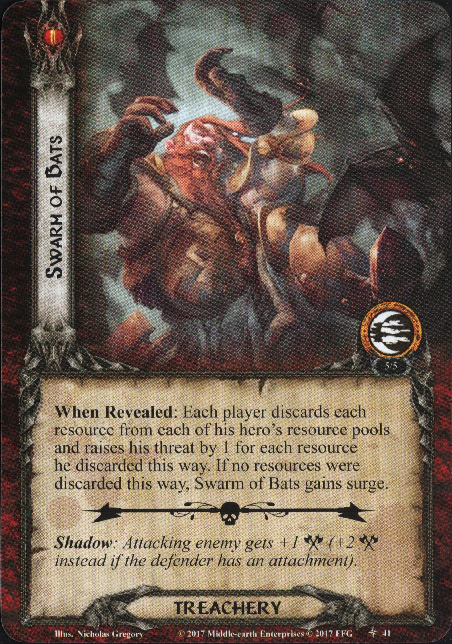 When Revealed: Each player discards each resource from each of his hero's resource pools and raises his threat by 1 for each resource he discarded this way. If no resources were discarded this way, Swarm of Bats gains surge.