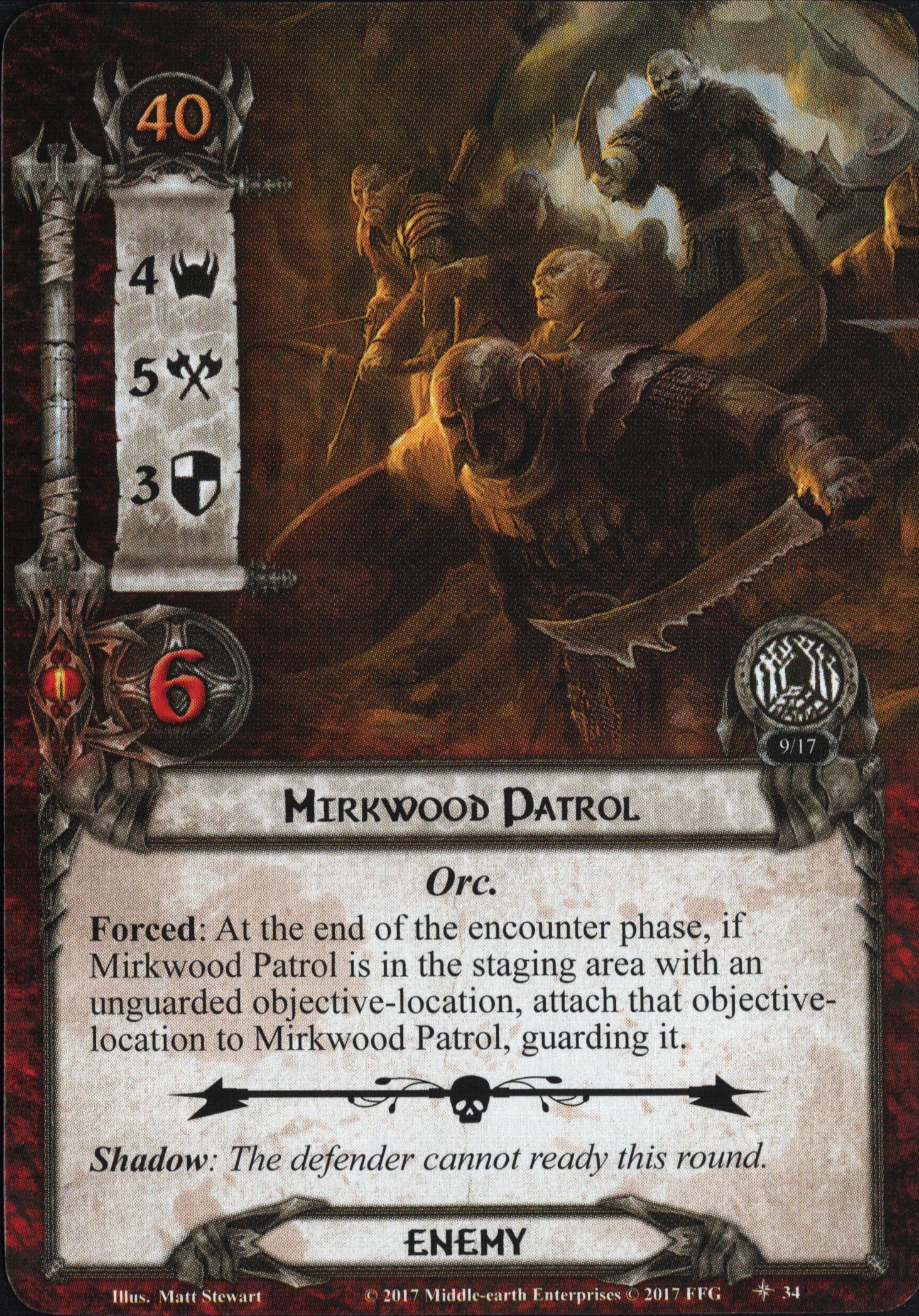 Forced: At the end of the encounter phase, if Mirkwood Patrol is in the staging area with an unguarded objective-location, attach that objective-location to Mirkwood Patrol, guarding it.