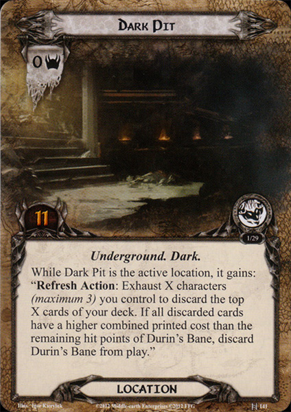 Refresh Action: Exhaust X characters (maximum 3) you control to discard the top X cards of your deck. If all discarded cards have a higher combined printed cost than the remaining hit points of Durin's Bane, discard Durin's Bane from play.