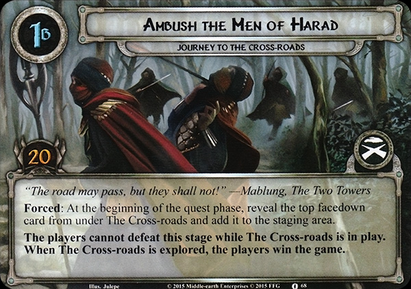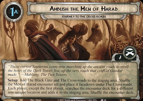 Setup: Add The Black Gate and The Cross-roads to the staging area. Shuffle the Harad encounter set and place it facedown under The Cross-roads. Each player, except for the first player, searches the encounter deck for a different non-unique location and adds it to the staging area. Shuffle the encounter deck.