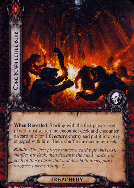When Revealed: Starting with the first player, each player must search the encounter deck and encounter discard pile for 1 Creature enemy and put it into play engaged with him. Then, shuffle the encounter deck.