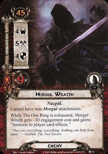While The One Ring is exhausted, Morgul Wraith gets -30 engagement cost and gains: "Immune to player card effects."